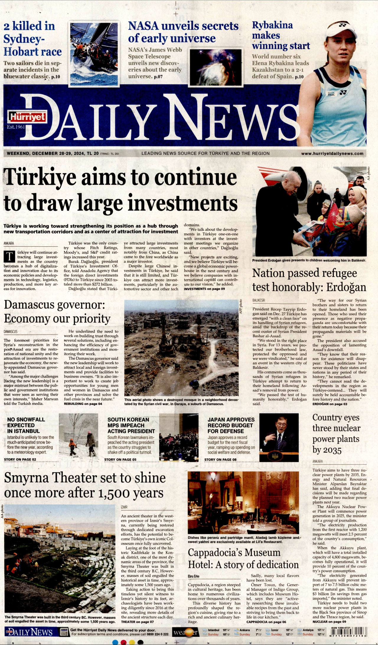 HÜRRİYET DAİLY NEWS Gazetesi 28 Aralık 2024, Cumartesi Günü Manşeti