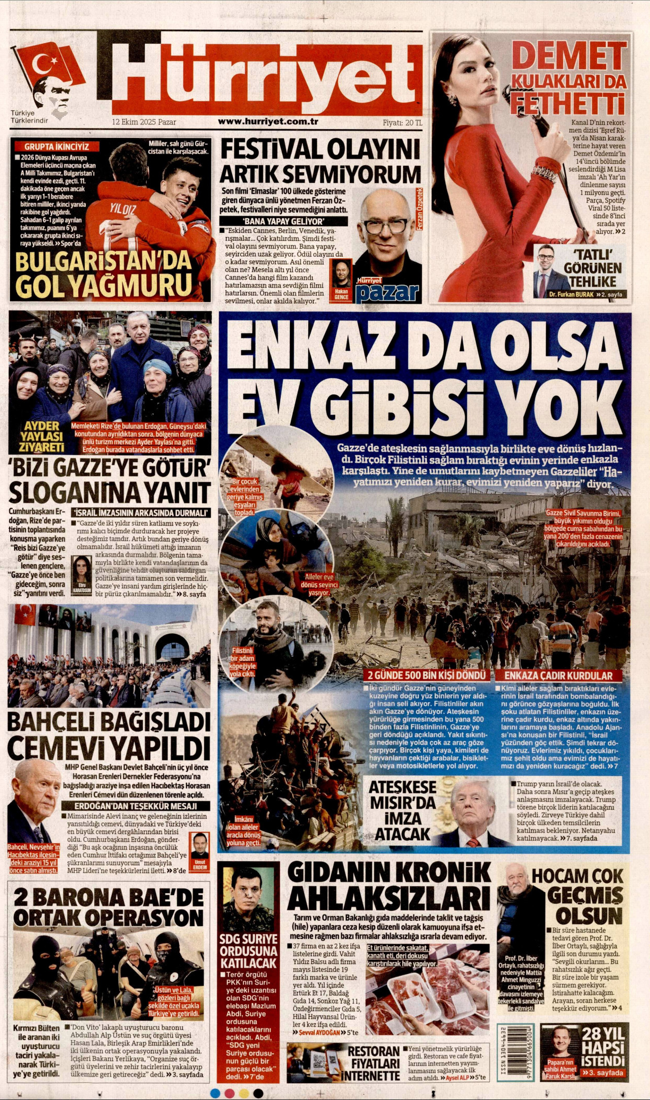 HÜRRİYET Gazetesi 12 Ekim 2025, Pazar Günü Manşeti