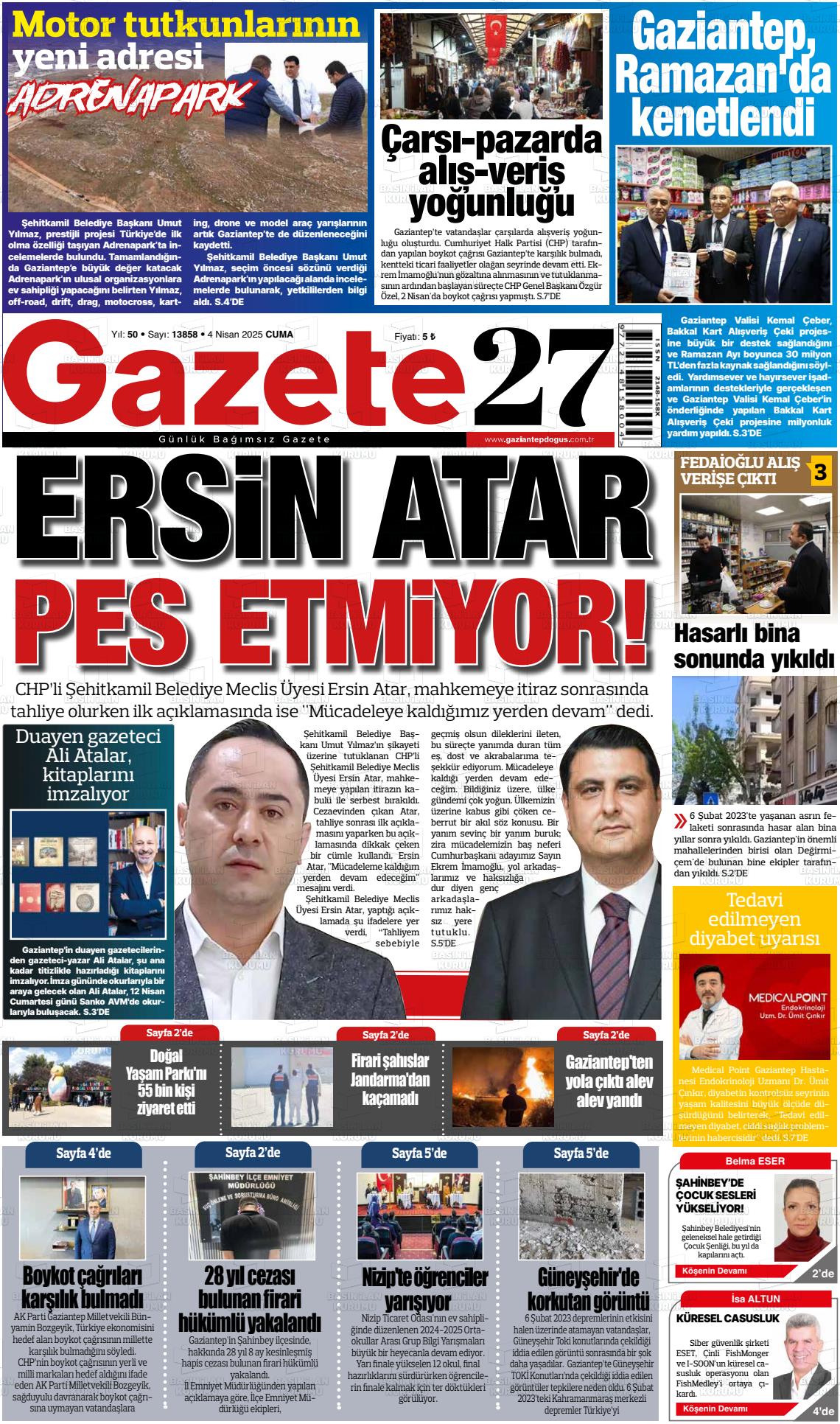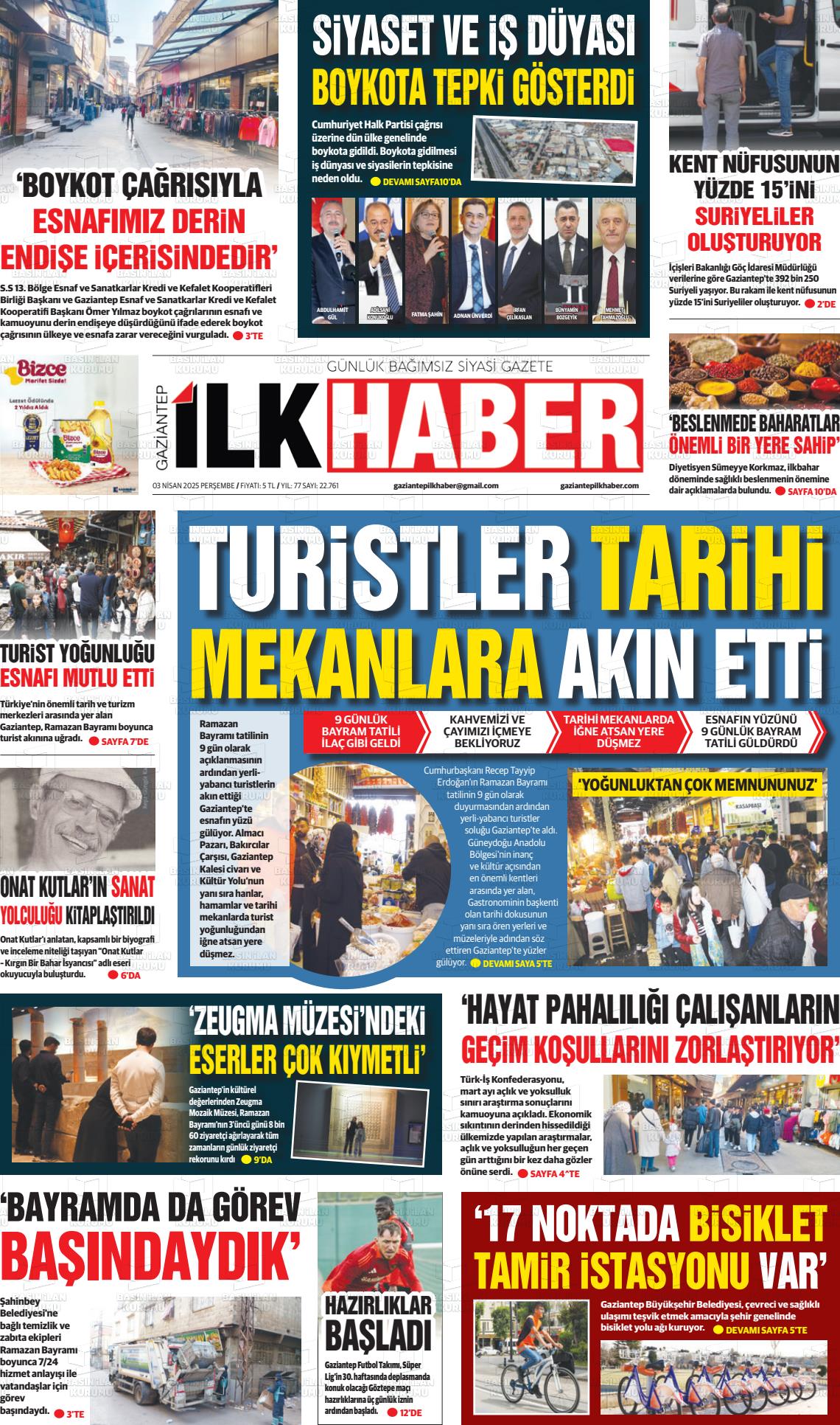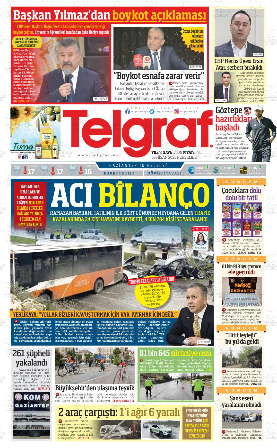 Gazİantep Yerel Gazeteleri 18 Mart 2026, Çarşamba Günü Manşeti